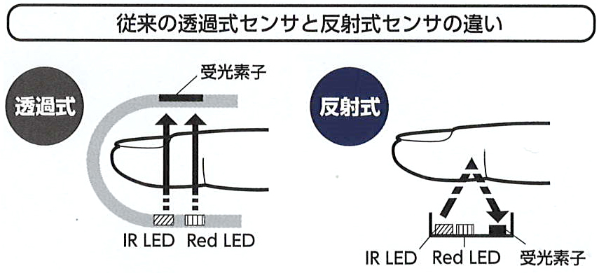 ネイルやマニキュアの影響を受けづらい「反射式測定方式」を採用。救急等で患者を選ばずに測定可能です。